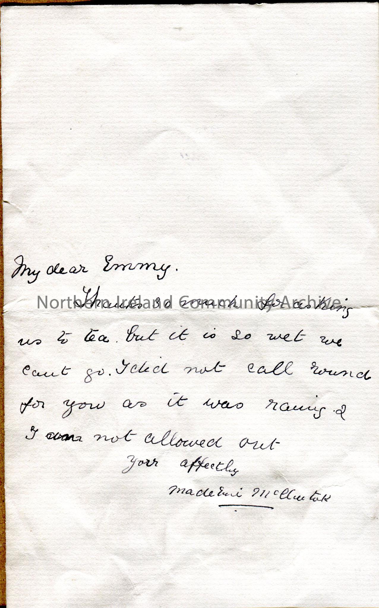 Folded double page of handwritten letter in ink, with stamped address at heading. Addressed to 'Dear Emmy'. Short note on one side only - was not able to go to tea because of bad weather