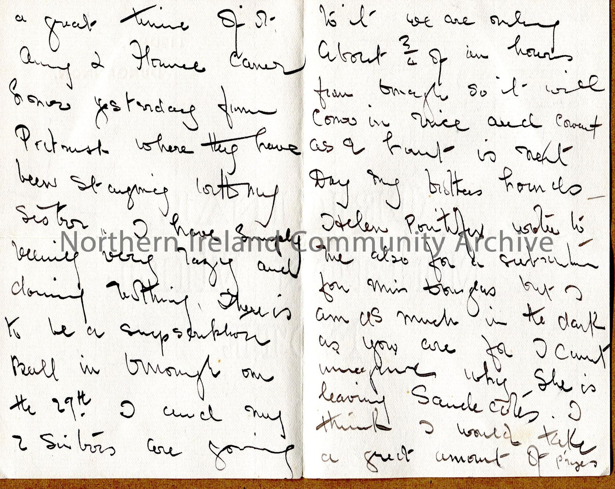Folded double page of handwritten letter in ink, with stamped address at heading. Addressed to 'Dear Emmy'. Wishes her Happy Xmas. Florence has arrived from Portrush. Going to Ball in Omagh on 29th with sisters.