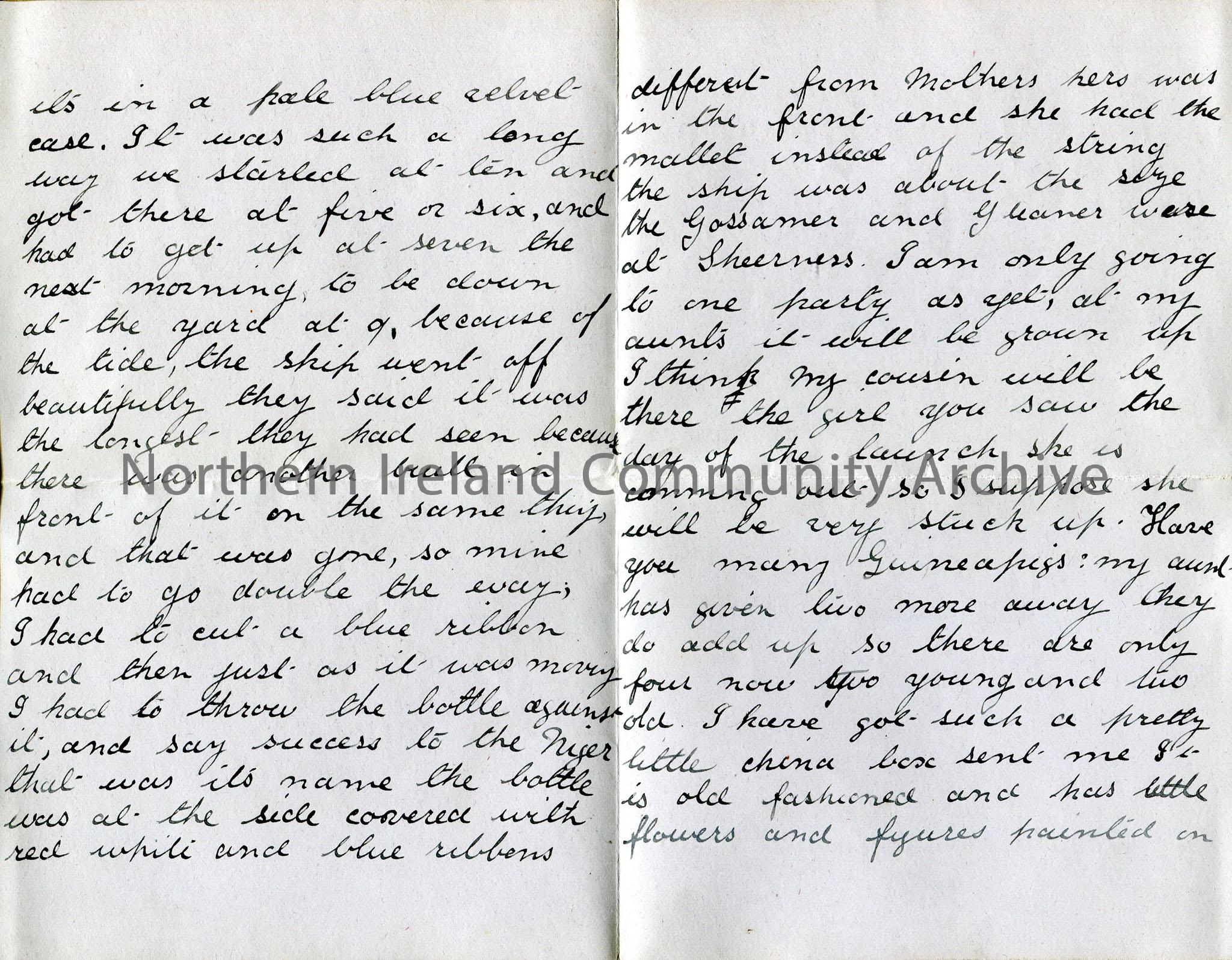 Folded double page of handwritten letter in ink, with stamped address at heading. Addressed to 'My Dear Baby'. Christmas. Author Mabel King launched ship 'Niger' in Barrow in Furness [torpedoed in 1914 - see attached documents] and received gold watch - describes ceremony.
