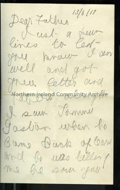 Folded double page of handwritten letter in pencil from James to his father. Still in Finner. Saw Tommie Gaston from home. Mentions Ulster Division being in action. Hopes to be home for 12th July.