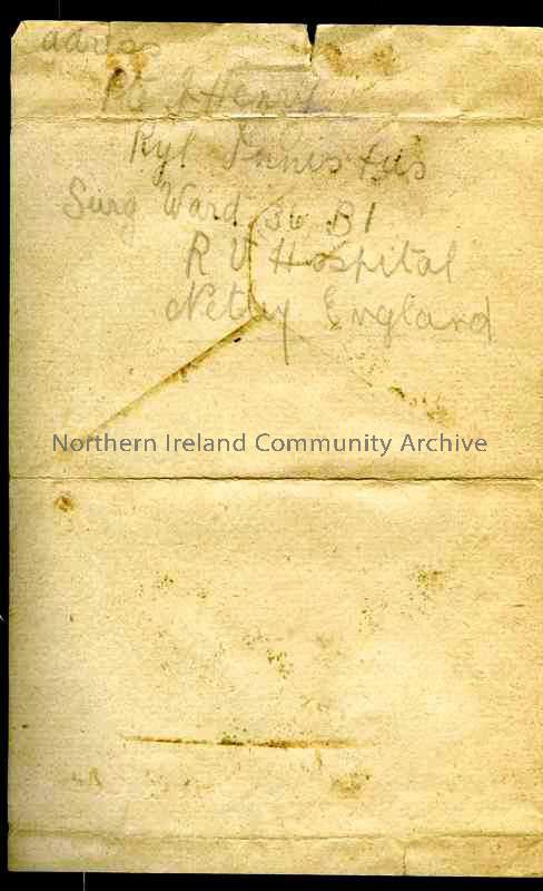Folded double page of handwritten letter in pencil, on Australian Red Cross headed notepaper,from James to his father. In hospital near Southampton following gunshot to leg but expects to be moved to Ireland. Asks them to send stamps as no money.