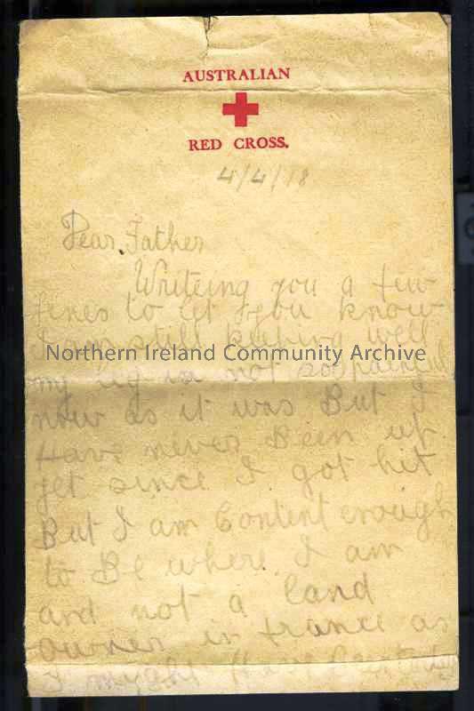 Folded double page of handwritten letter in pencil, on Australian Red Cross headed notepaper,from James to his father. In hospital near Southampton following gunshot to leg but expects to be moved to Ireland. Asks them to send stamps as no money.