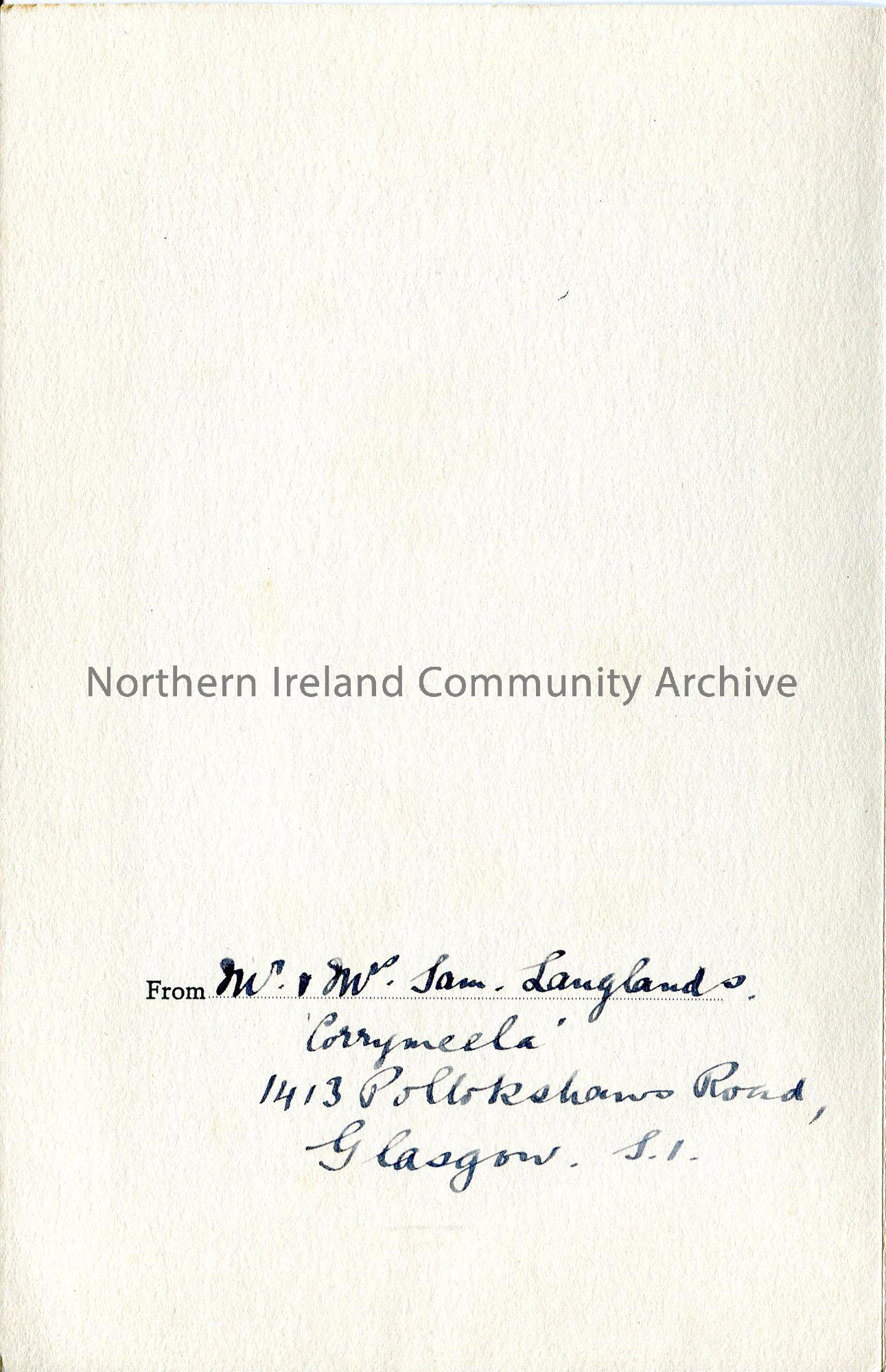 Folded greetings card. 'With Best Wishes' on front cover. Colour image on inside cover of a bird captioned, 'Waxwing'. From Mr and Mrs Sam Langlands, Corrymeela, 1413 Pollokshaws Road, Glasgow, S.1.