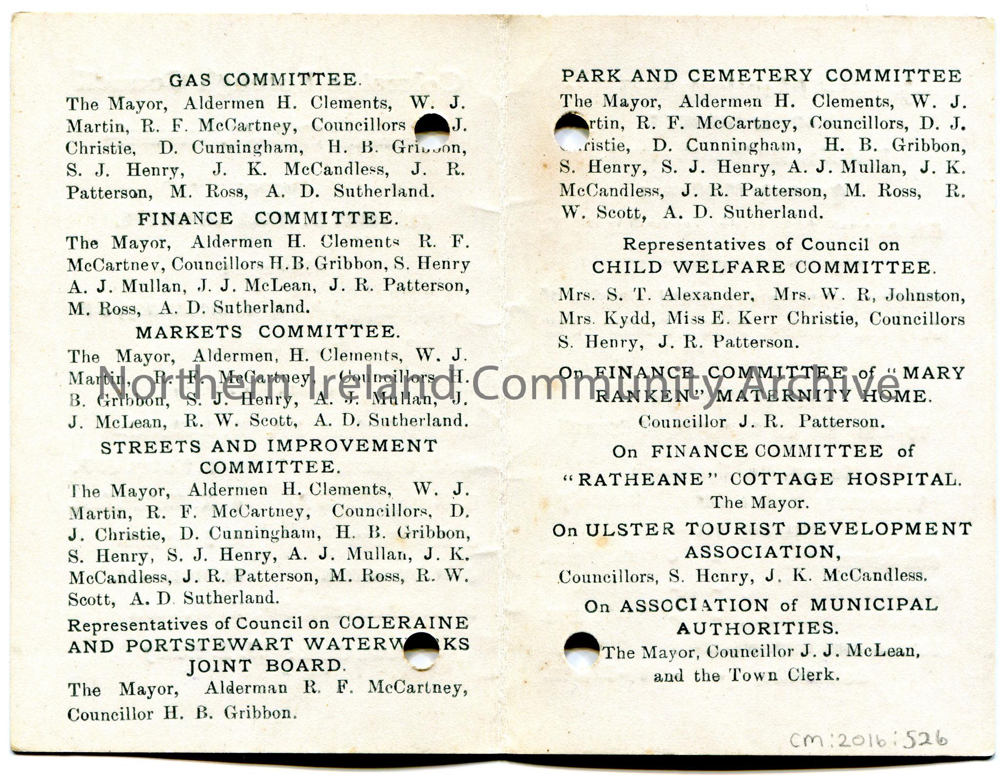Folded, yellow card. Coleraine Borough Council card. Dated 1945-1946. States Mayor as Alderman D. Hall Christie. Gives names of Aldermen and Councillors. States Sam Henry's Brother as Town Clerk W.E.Henry. Give names of Committee members. On reverse of card states times and dates for Council meetings.