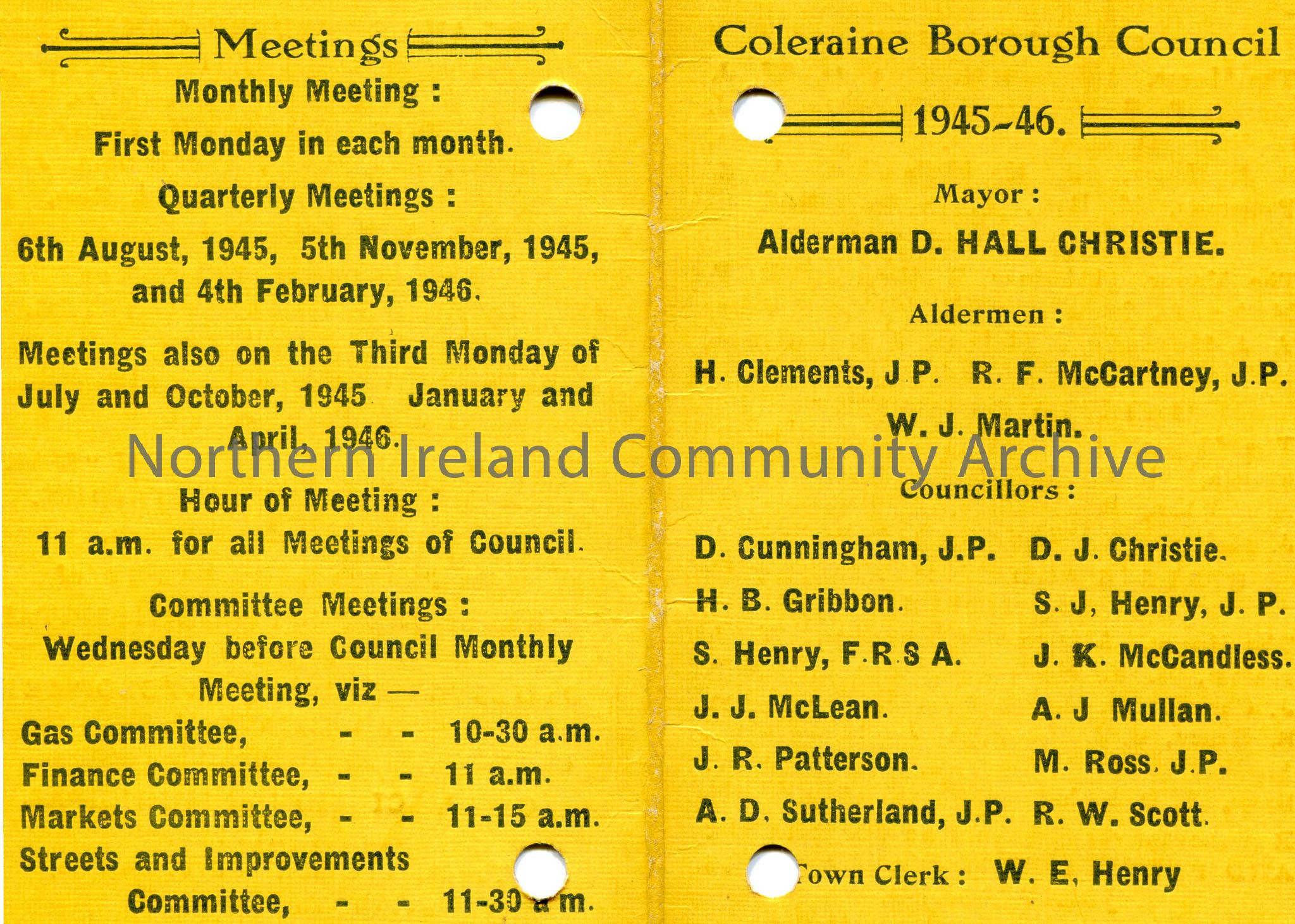 Folded, yellow card. Coleraine Borough Council card. Dated 1945-1946. States Mayor as Alderman D. Hall Christie. Gives names of Aldermen and Councillors. States Sam Henry's Brother as Town Clerk W.E.Henry. Give names of Committee members. On reverse of card states times and dates for Council meetings.