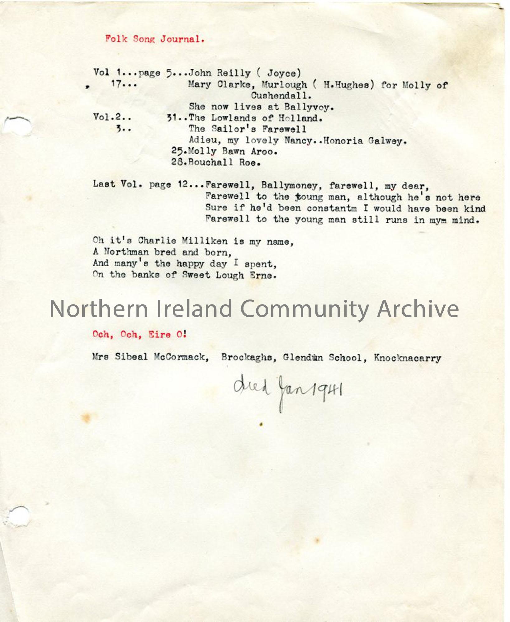 Typed notes - 'Folk Song Journal'. Names of people, notes about them, song titles and some verses.