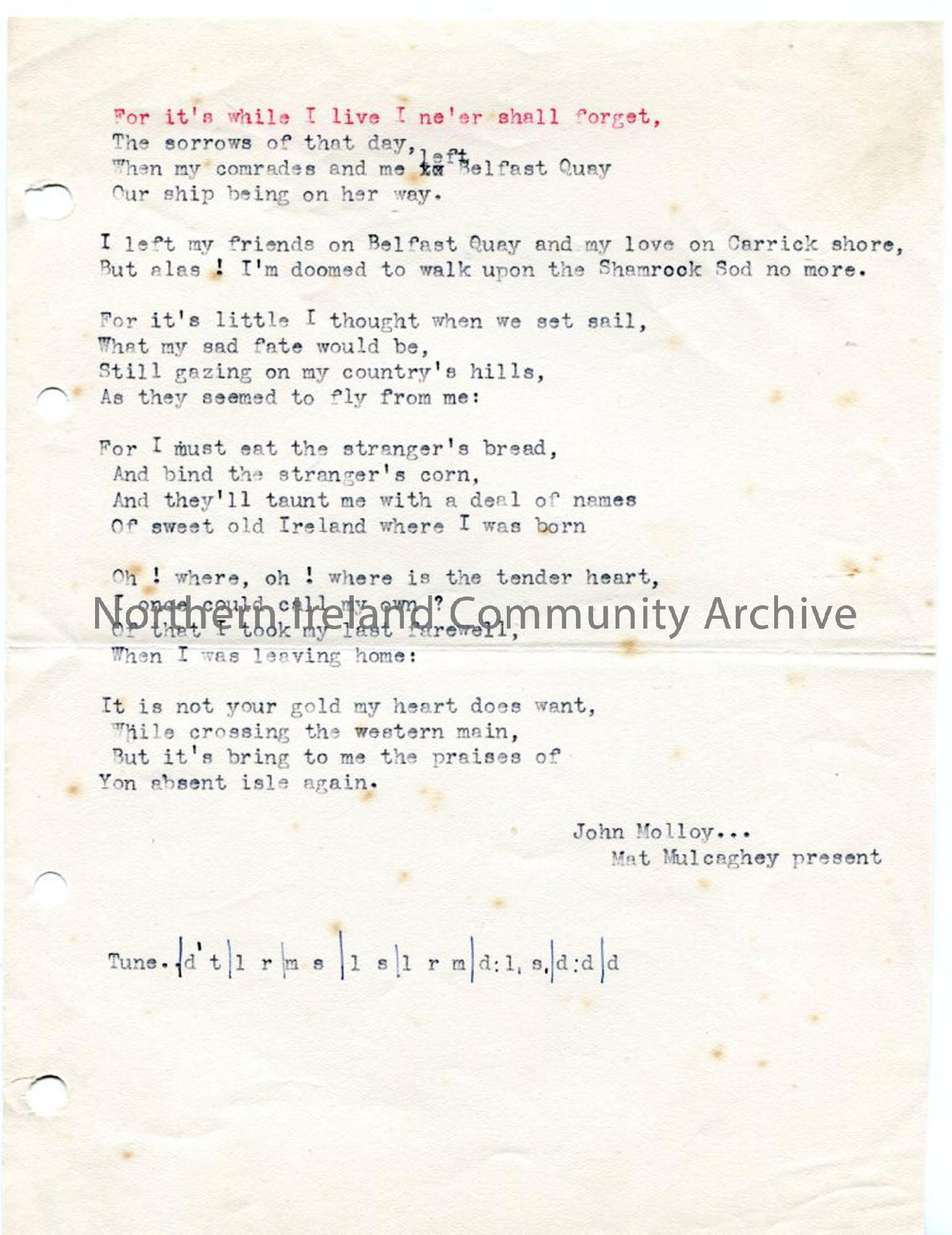 Typed words and tonic sol-fa notation to 'For it's while I live I shall ne'er forget'. From John Molloy - notes 'Mat Mulcaghey present'.