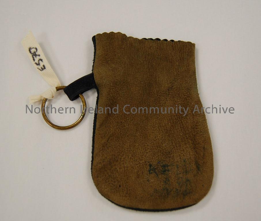 Four brass military buttons and pouch found at Dunluce Castle. – 2010.416 (2)