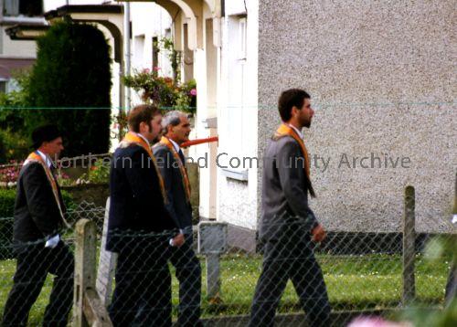 Four Orangemen belonging to LOL 534 on a twelth day demonstration walking up the wee avenue in Greystone known locally as lower Jerusalem. (1496)