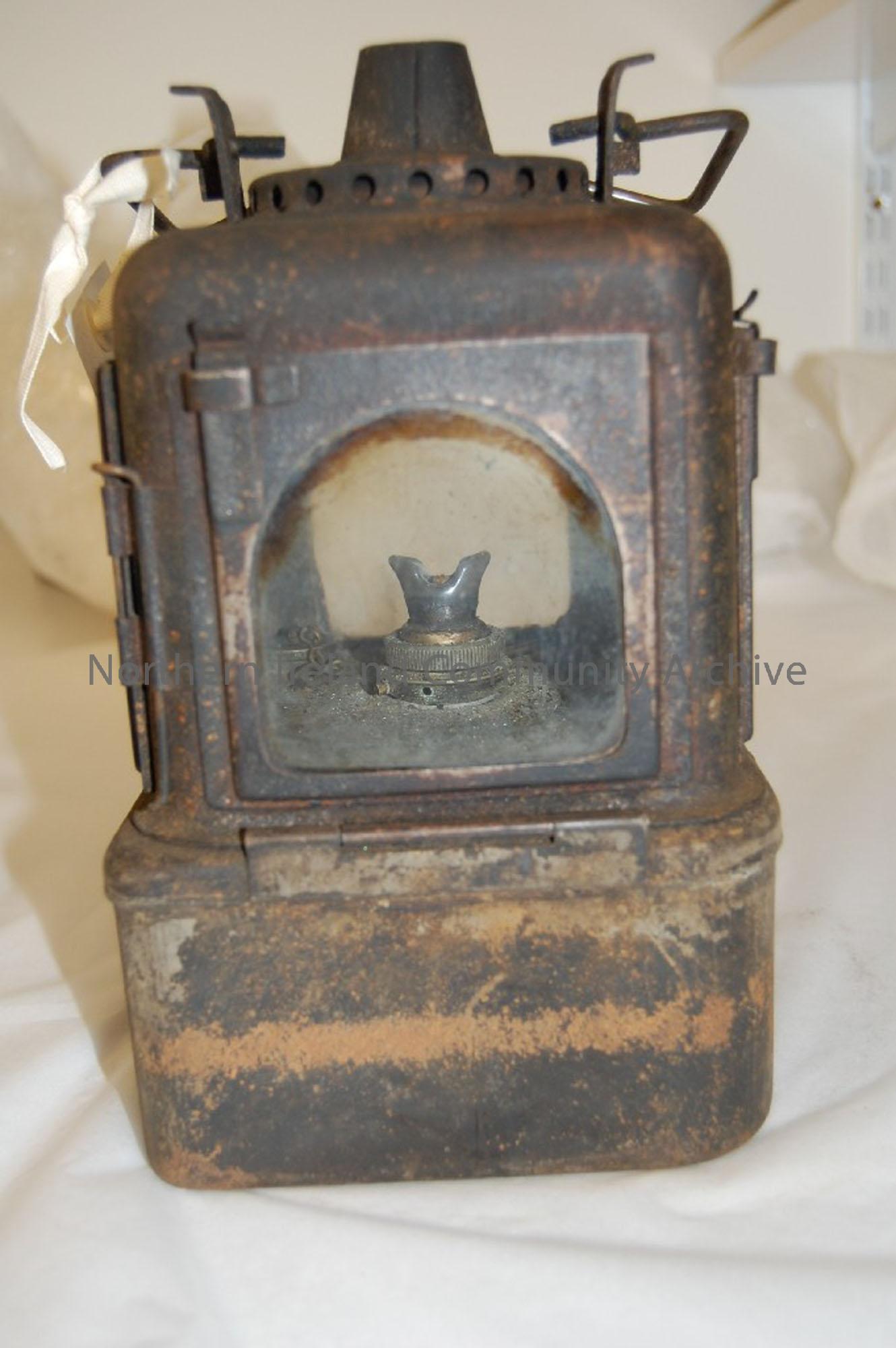 four sided paraffin lamp, with glass intact. Complete, blackened/tarnished by use. Requires restoration.