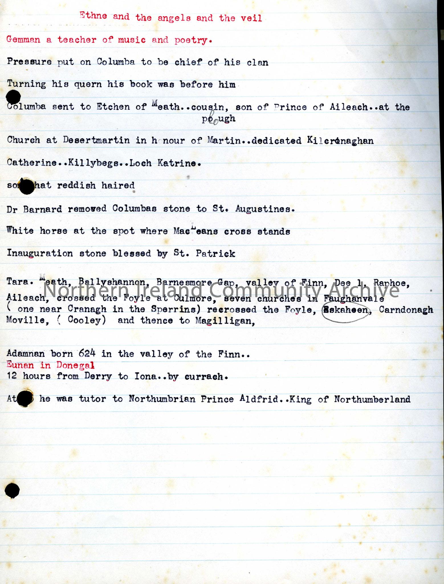 Fourth page of notes that seem to be for a talk entitled “Great Saint and Charming Sinner”. This page mentions Etchen of Meath who ordained St. Columb…