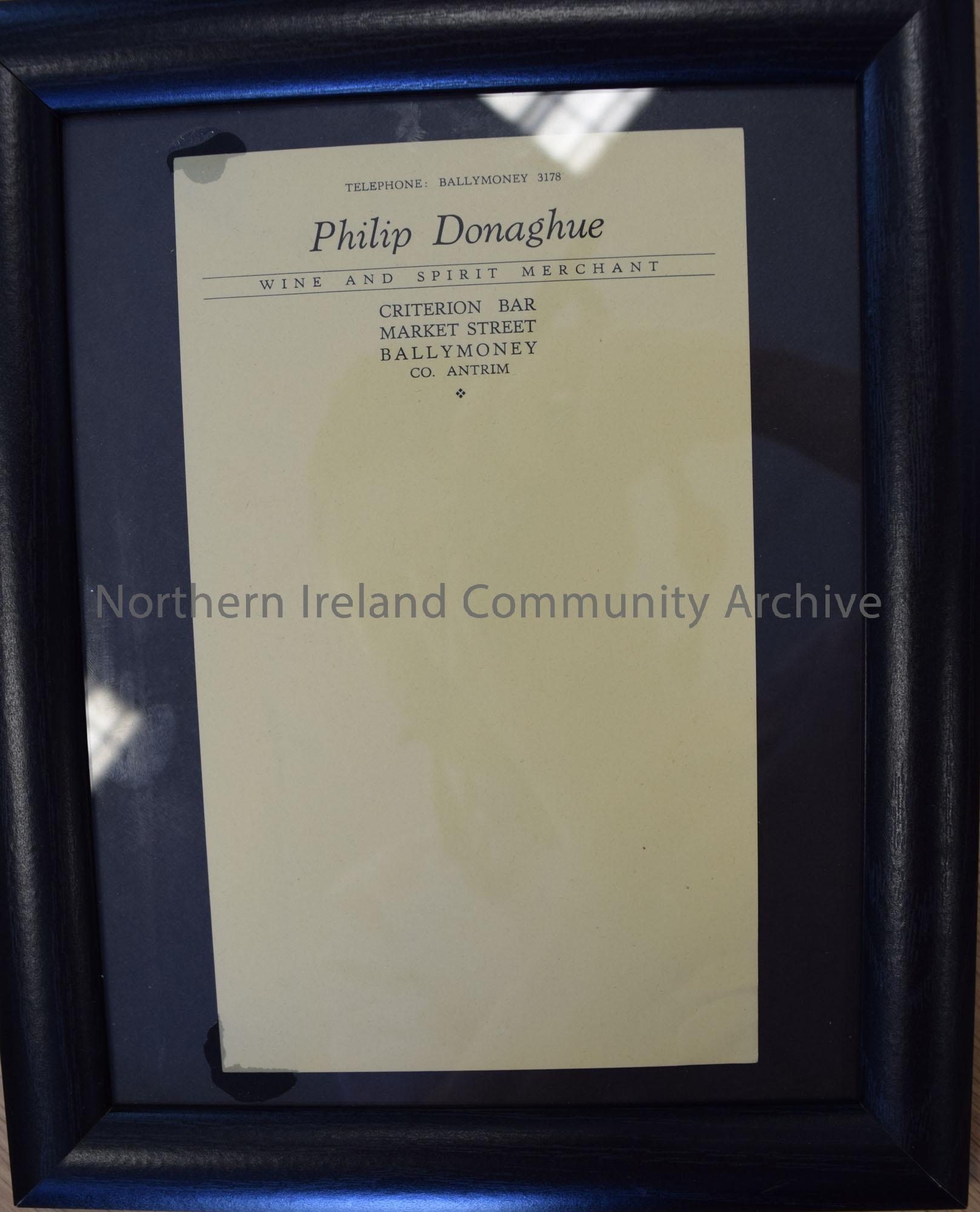 Framed letter read that reads 'Telephone: Ballymoney 3178 Philip Donaghue Wine and Spirit Merchant, Criterion Bar, Market Street, Ballymoney, Co. Antrim'