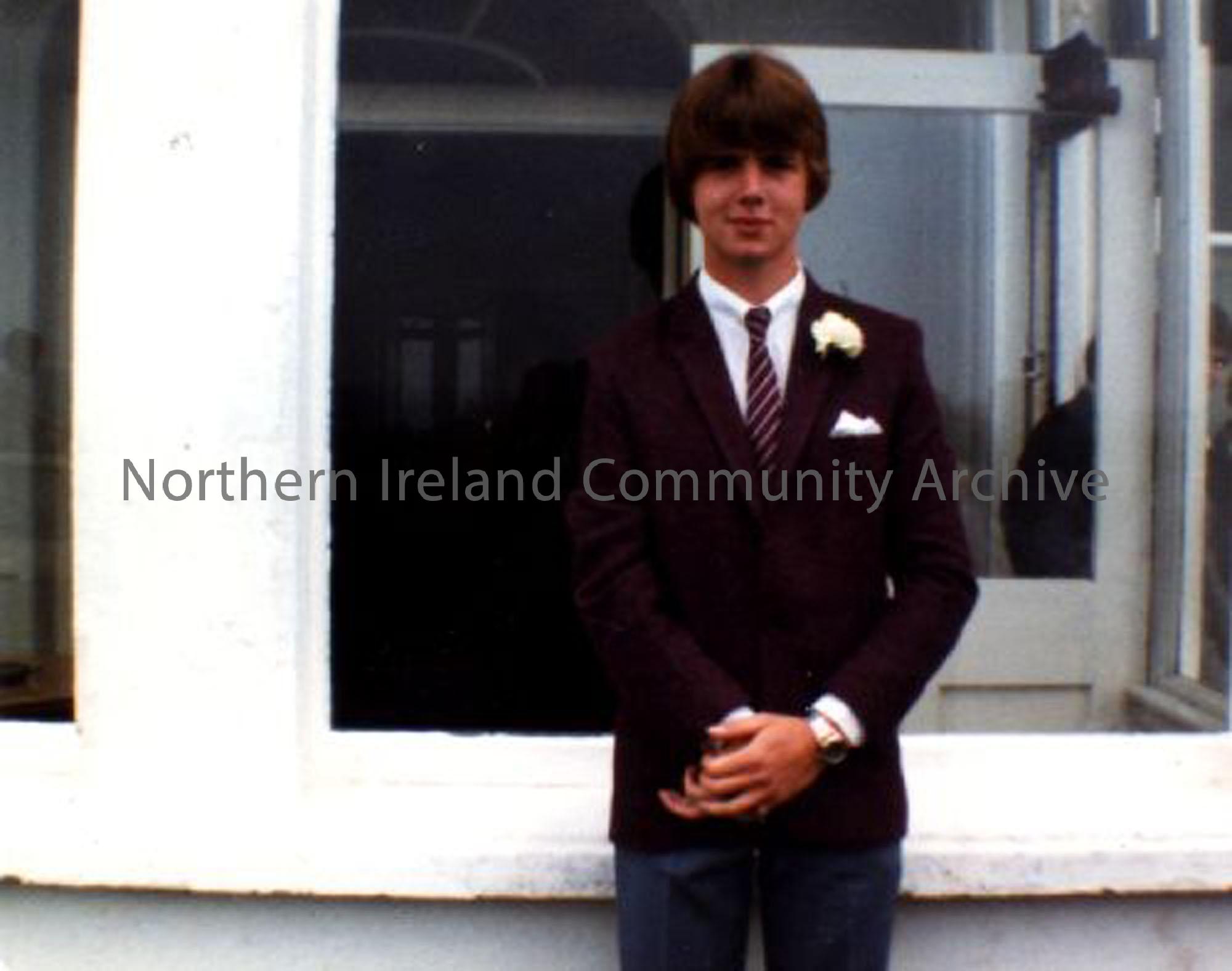 Frankie Cunningham posing in his wedding suit outside the Causeway Hotel.
