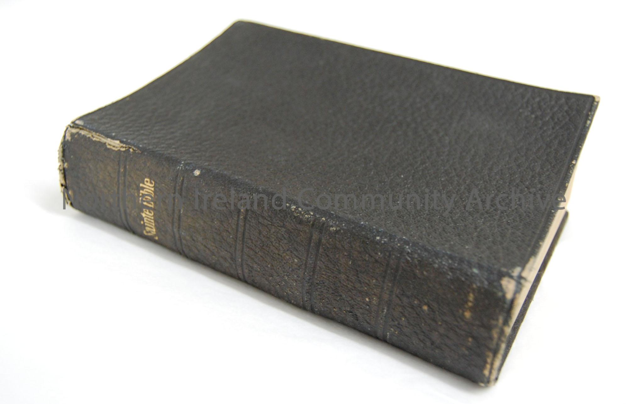 French Bible, inscribed 'Sainte Bible' on spine. Inner cover inscribed, 'Peggy Pollock, 1915'