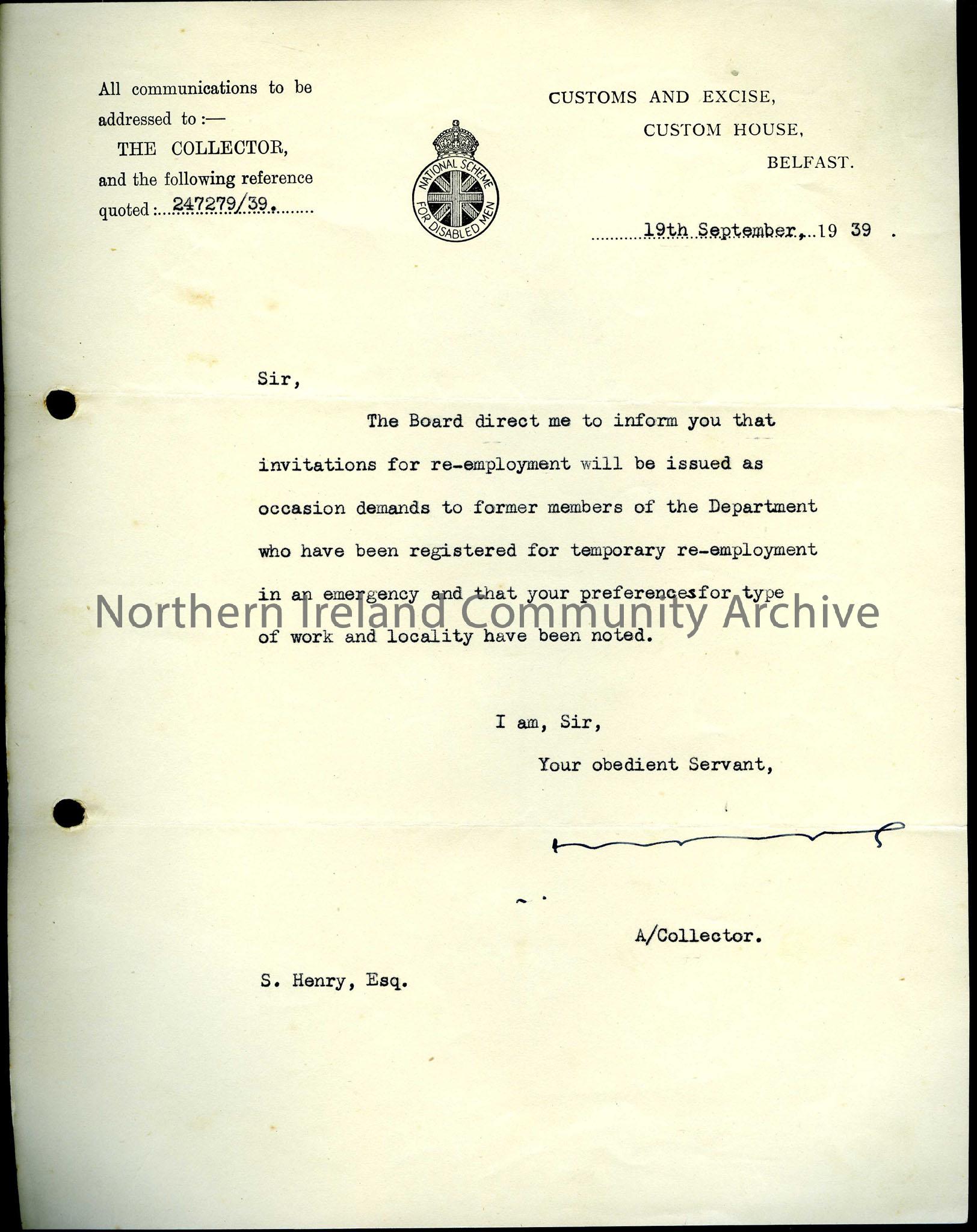 From Customs and Excise, Custom House, Belfast, dated 19th September 1939. Letter is regarding invitations for re-employment being issued when they ar…