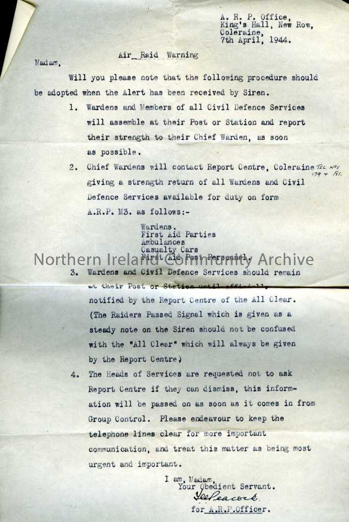 From ?Peacock, A.R.P Officer of the A.R.P Office, King's Hall, New Row, Coleraine and dated 7th April, 1944. It is addressed to 'Madam' and is titled 'Air Raid Warning'. The letter details the procedure which should be followed when the alert has been received by siren.