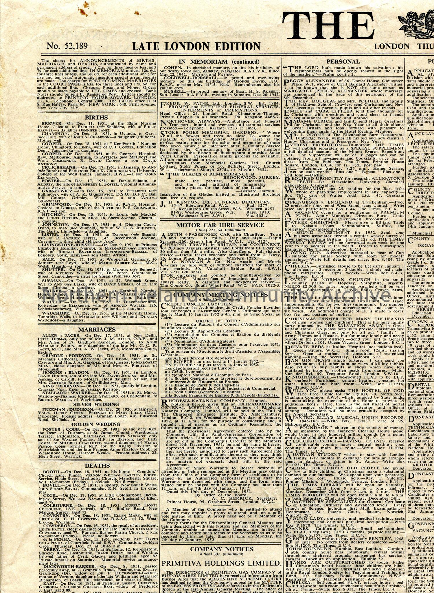 Front and back page from 'The Times' newspaper, 'Late London Edition'. Dated Thursday 20th December, 1951. Includes 'A Route to Everest' feature, births, deaths marriages and general news articles.