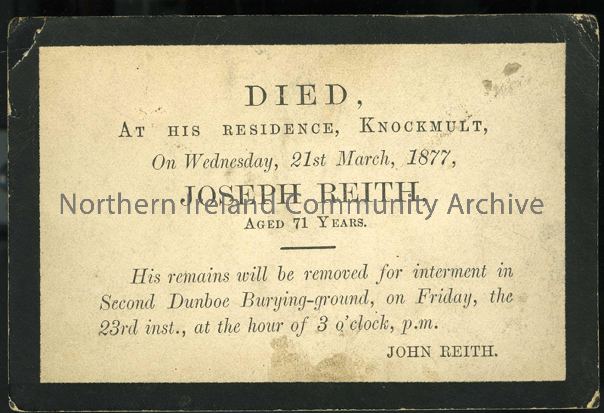 Funeral card for Joseph Reith. Courtesy of David and Annie Lawrence