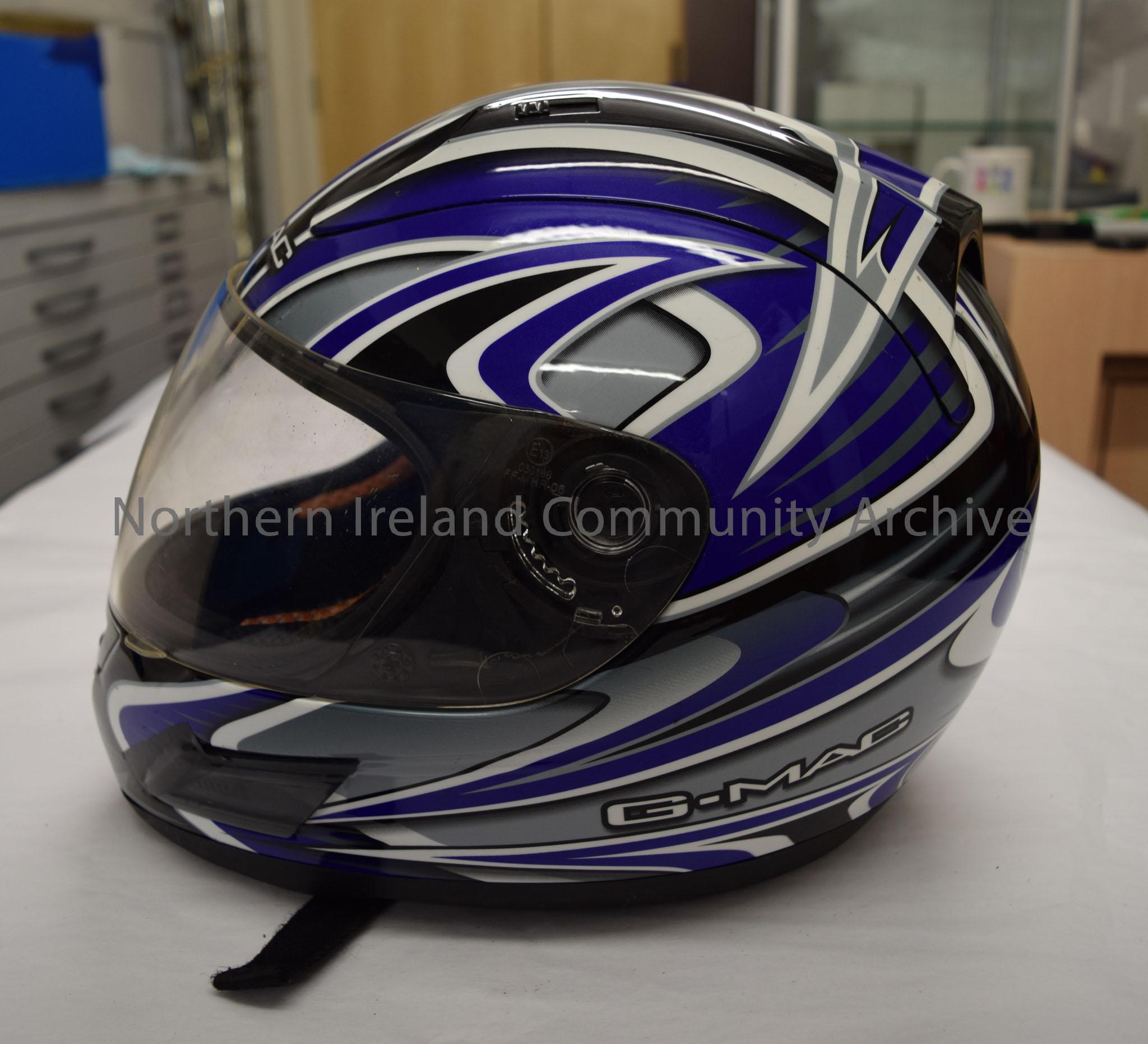 G-Mac motorcycle helmet. Blue, black, white and grey patterned. – 2016.15 (3)