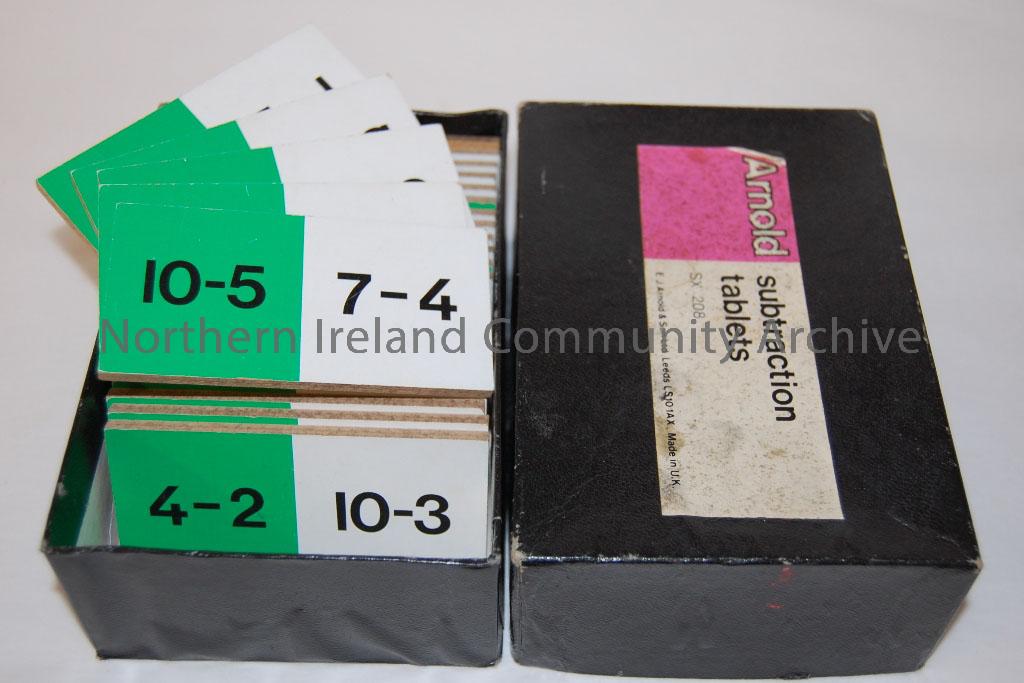 Game played like dominos to help learn subtraction, c.1970. 28 pieces in box, made from wood, all green and white with sums printed on them. Box is black, with white and pink label. Made by E.J. Arnold & Sons Ltd, Leeds.