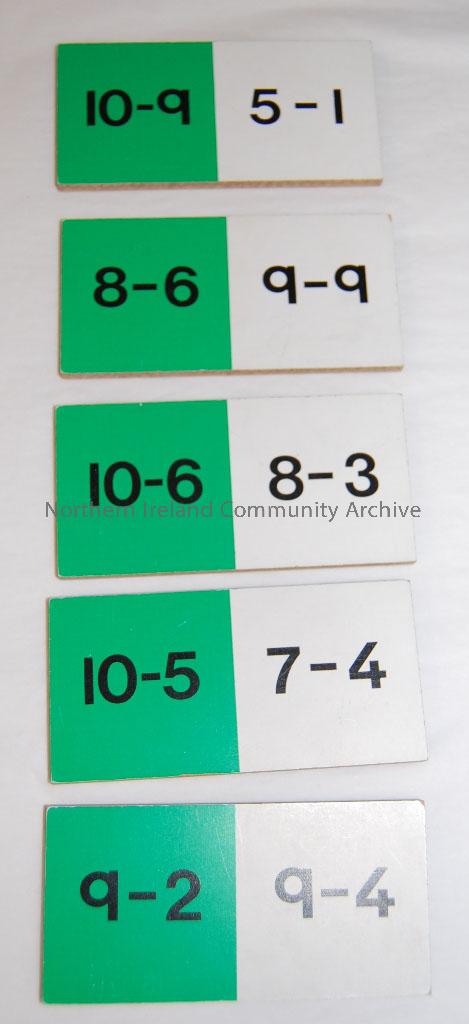 Game played like dominos to help learn subtraction, c.1970. 28 pieces in box, made from wood, all green and white with sums printed on them. Box is black, with white and pink label. Made by E.J. Arnold & Sons Ltd, Leeds.