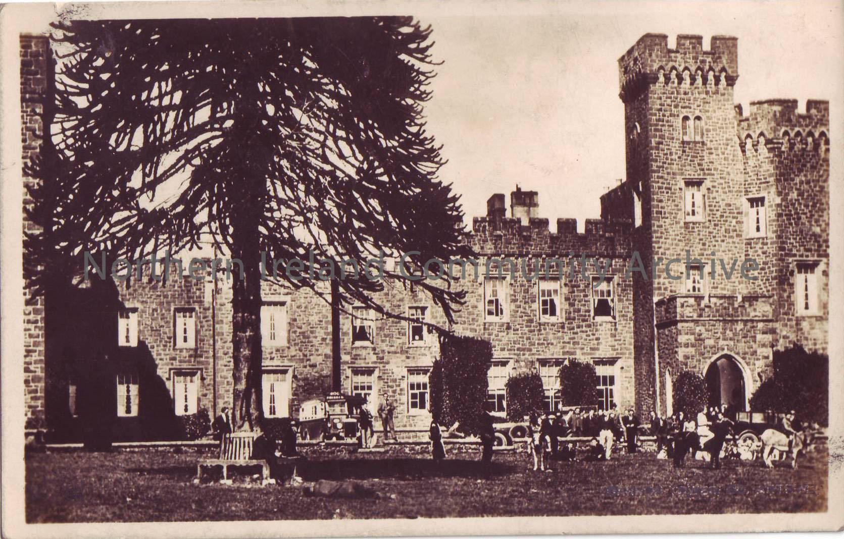 postcard depicting Garron castle or tower. with people on lawn with cars, horses and caravans