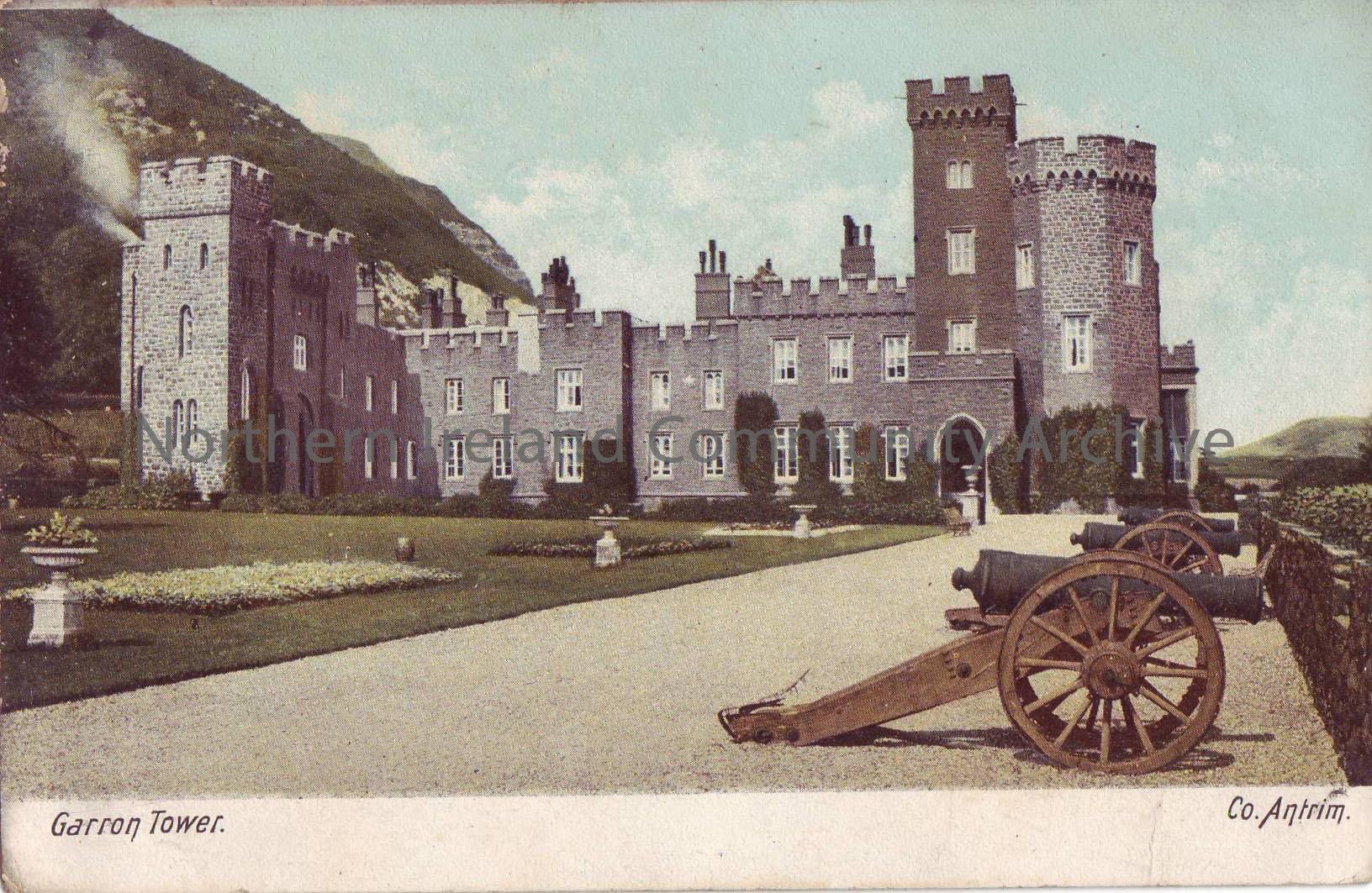postcard depicting Garron Tower County Antrim, with castle and cannons.