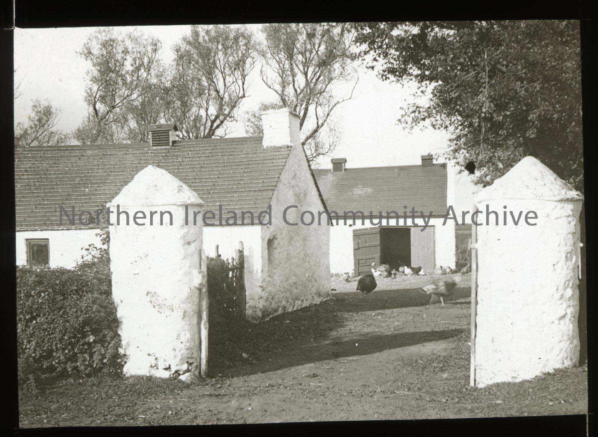 White round Ulster-Scots style gateposts at entrance to farm