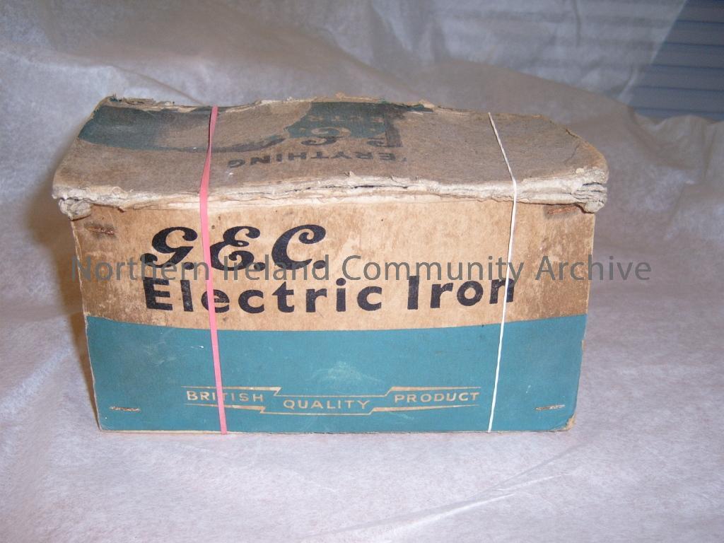 GEC Electric iron in original box. Metal smoothing iron with Chromium plate covered case and large black plastic handle. Small adjustable dial. Cat No.D5805, weight 5ibs, Consumption 450 Watts (2983)