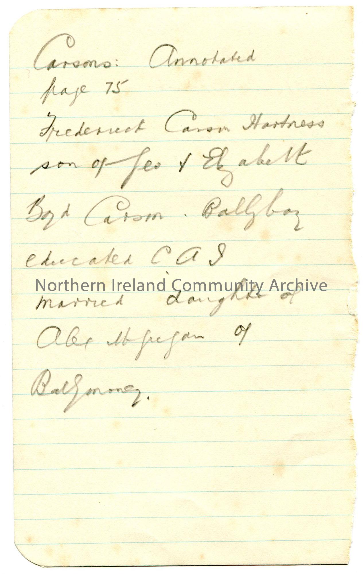 Genealogical notes (double sided) handwritten in pencil notes taken at Record Office, Dublin; note from Belfast Newsletter 9th January, 1827 re Blair family, Ballymaglin and genealogical notes re Frederick Carson Harkness, Ballybog.