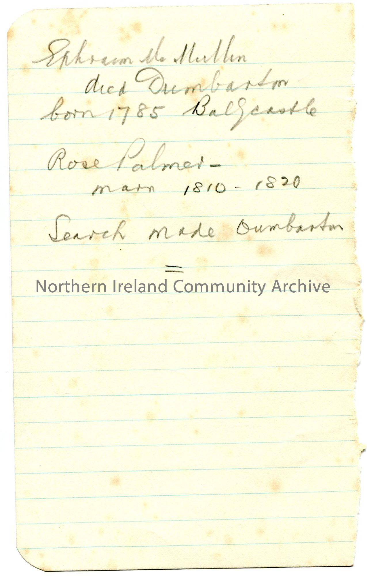 Genealogical notes (double sided) handwritten in pencil re Stark family of Londonderry [America]. Also Ephraim McMullan, born in Ballycastle 1785.
