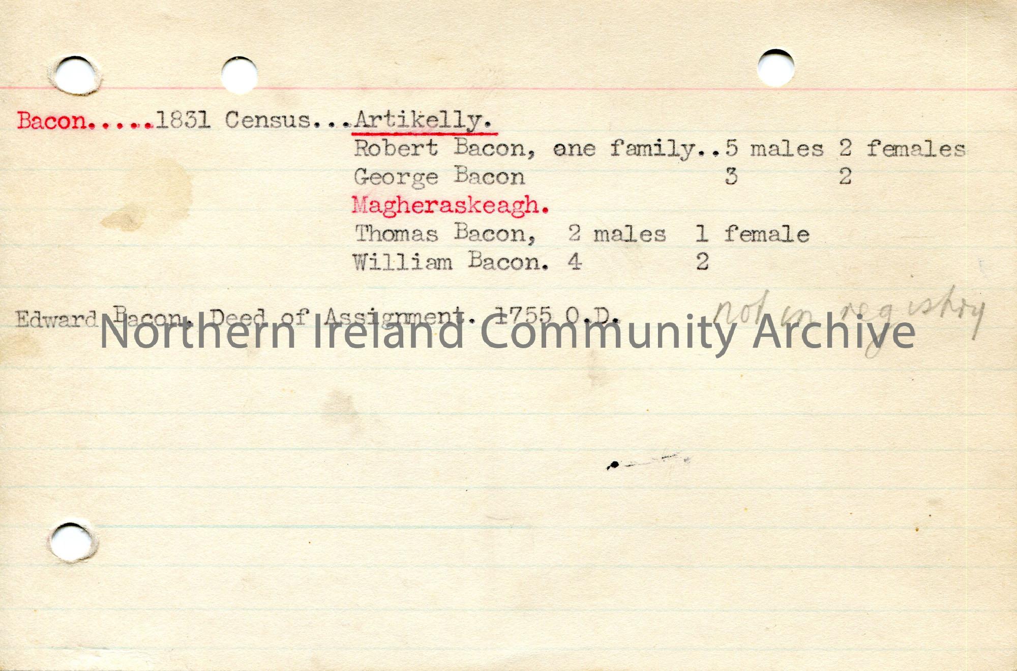 Genealogical notes typed onto lined card re Bacons of Artikelly.