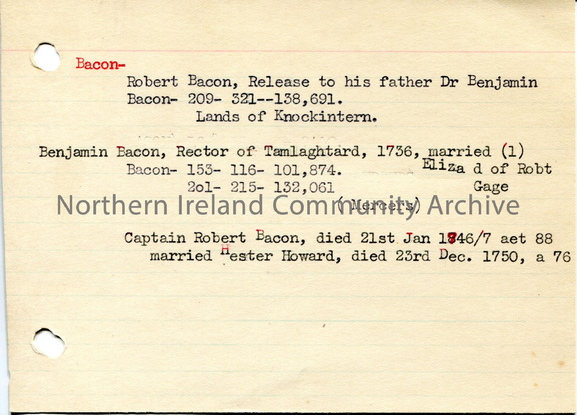 Genealogical notes typed onto lined card re the name Bacon. Refers to Robert Bacon, Benjamin Bacon, Rector of Tamlaghtard 1736 and Captain Robert Bacon.