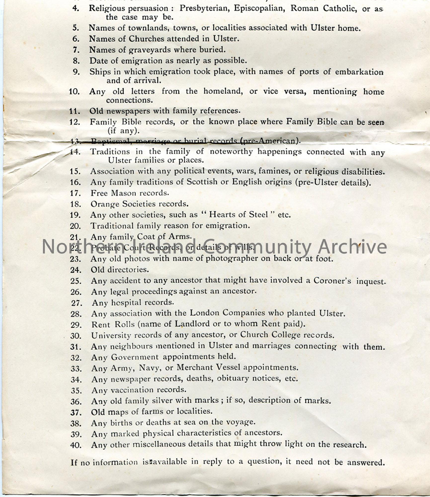Genealogical questionnaire issued by Sam Henry to capture information from people as part of his genealogical research. List of 40 questions re marriage, records, deaths, notices, religion and other genealogical style questions.