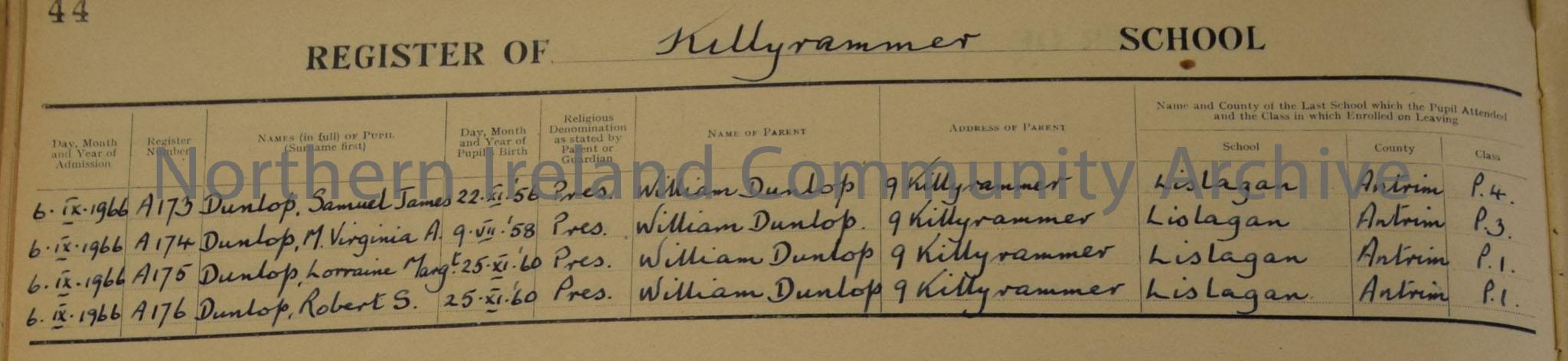 General Register of Killyrammer Primary School. Pale green book with yellow binding and white sticker on front.