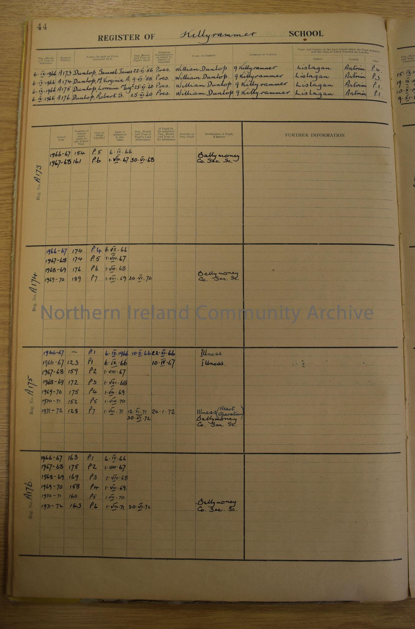General Register of Killyrammer Primary School. Pale green book with yellow binding and white sticker on front.