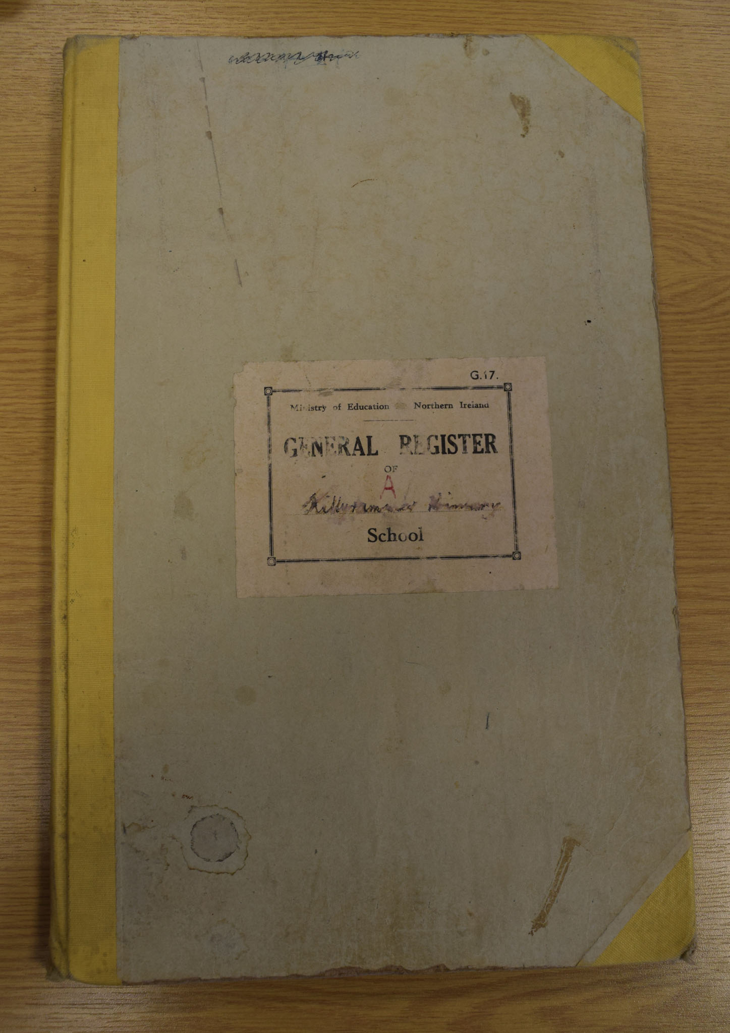 General Register of Killyrammer Primary School. Pale green book with yellow binding and white sticker on front.