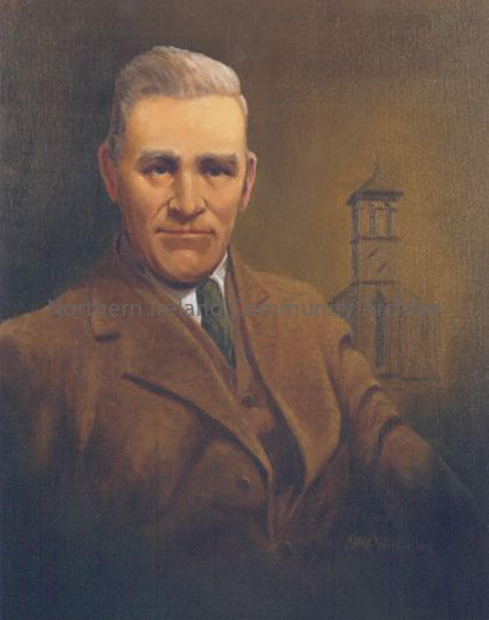 Portrait of playwright George Shiels, who is buried in Our Lady and St Patrick's graveyard, Castle Street, Ballymoney