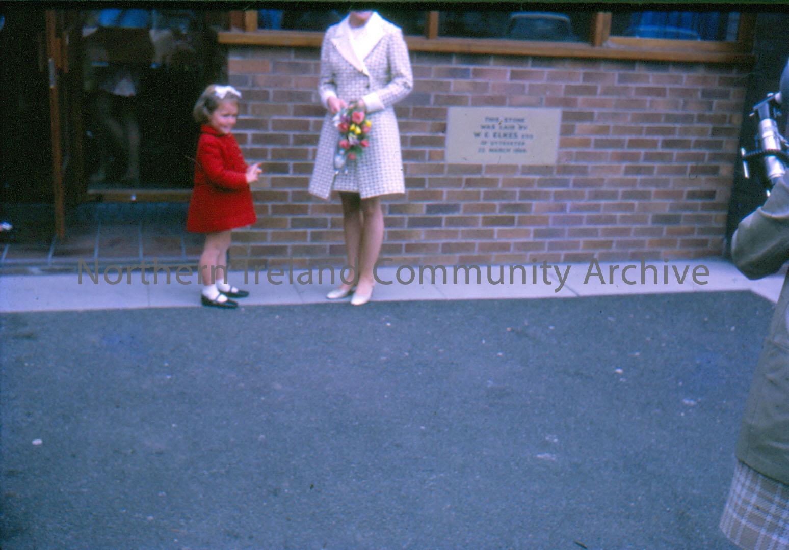 slide depicting girl in red coat presenting floral gift. Numbered 11 dated May 1970