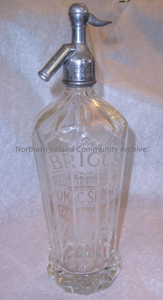 Glass bottel and metal soda syphon. Frosted on the front of the bottle, Briggs unrivalled Cromac Springs. Table waters, Belfast. Mayo Syphons Ltd, London. Inscribed onto the metal syphon at the top is Briggs Cromac Springs Belfast /40. Metal syphon also s