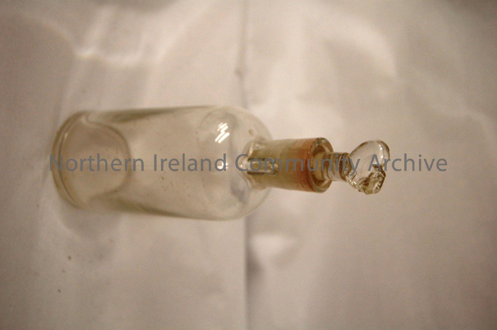 Glass bottle with a glass stopper on top- used to store chemicals