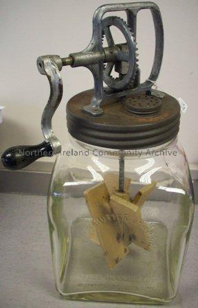 Small quantities of butter could be made in this glass churn. It worked by turning the handle that drove the paddle that stiffened the cream into butter. Its advantage over the wooden churns was that it was very easy to see when the butter had been made and the job was finished. Donated by Mr. & Mrs. C. Wilson.