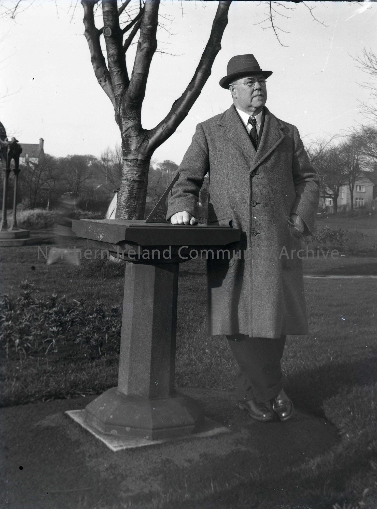 Glass slide negative of a black and white photographic image. Features Sam Henry in Anderson Park, Coleraine, standing to the right of a sundial.