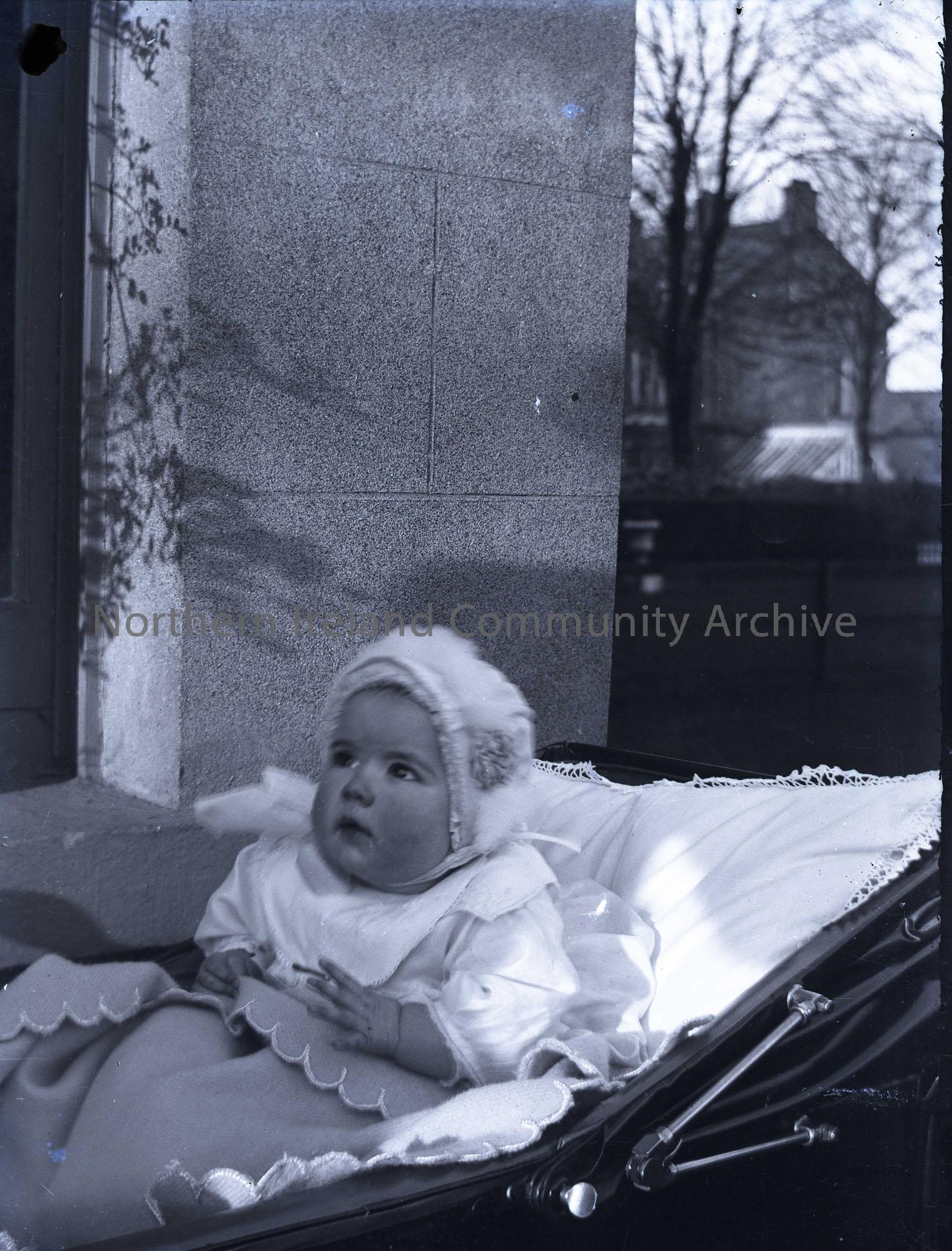 Glass slide negative of a black and white photographic image. Features Sam Henry's daughter, Olive, as a baby sitting in a pram wearing a bonnet.