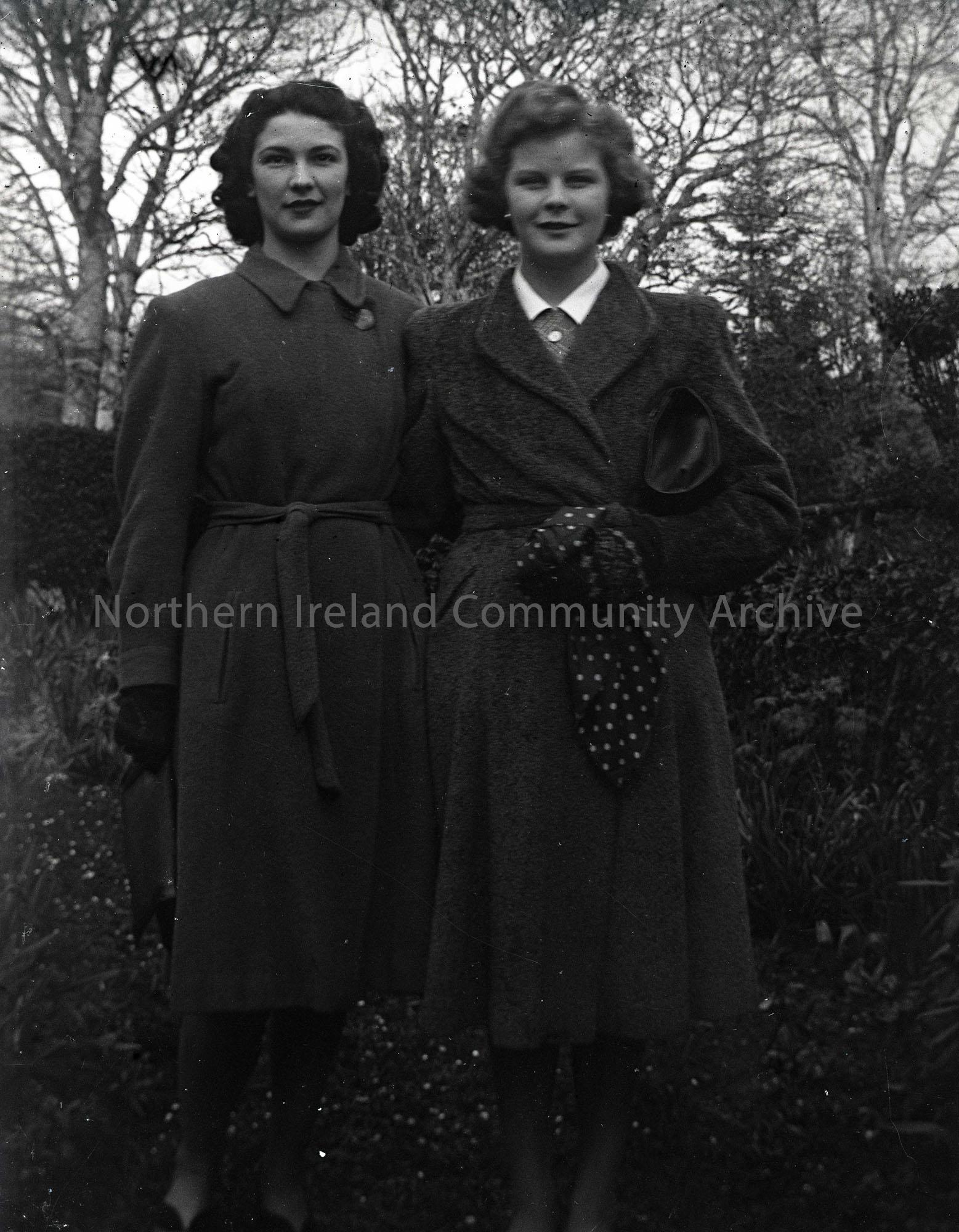 Glass slide negative of a black and white photographic image. Features Sam Henry's daughter, Olive, as a young woman (left) standing beside another woman.