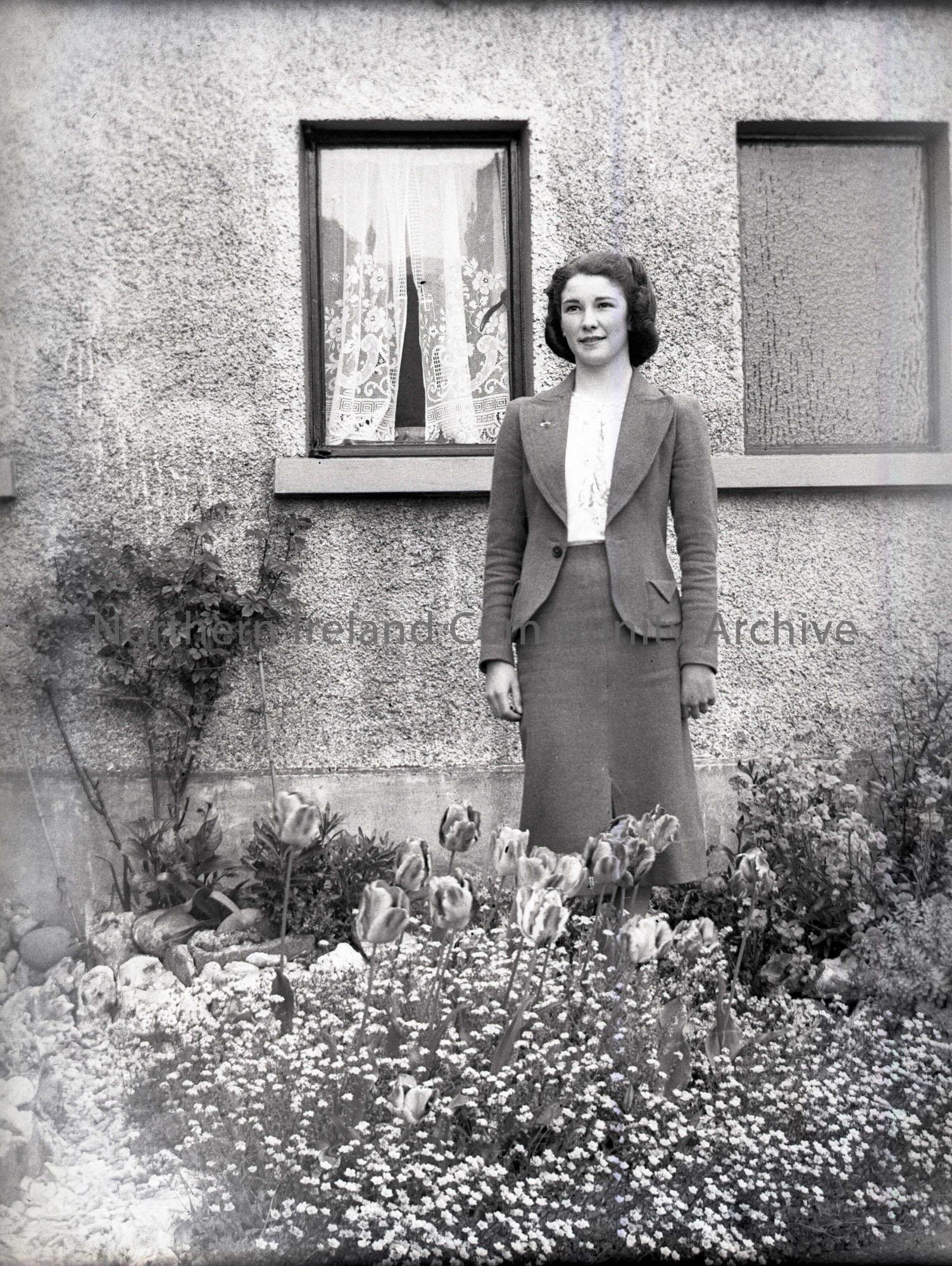 Glass slide negative of a black and white photographic image. Features Sam Henry’s daughter, Olive, as a young woman standing in a garden. ‘?41’ is wr…