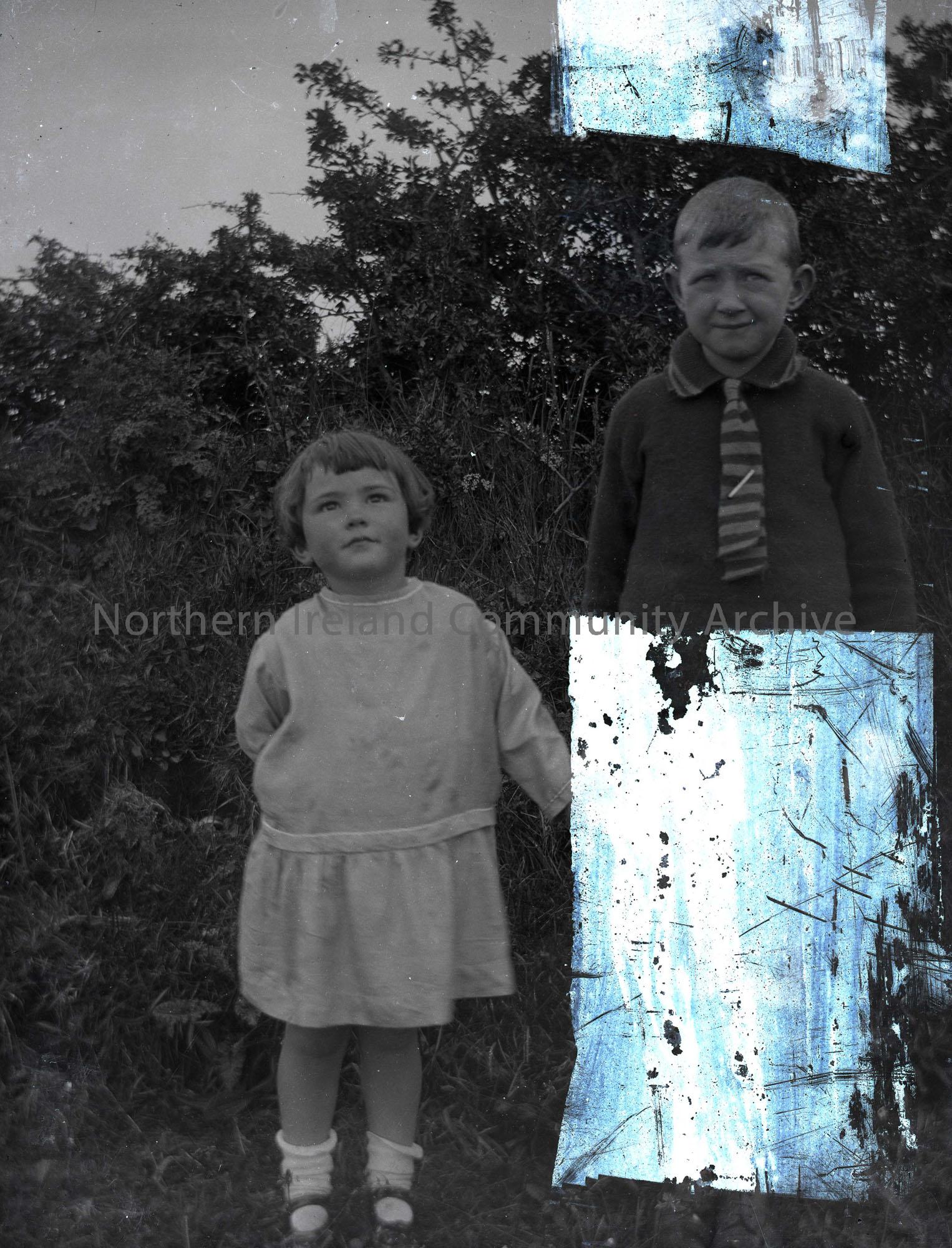Glass slide negative of a black and white photographic image. Features Sam Henry's daughter, Olive, standing and holding hands with a young boy in a garden.