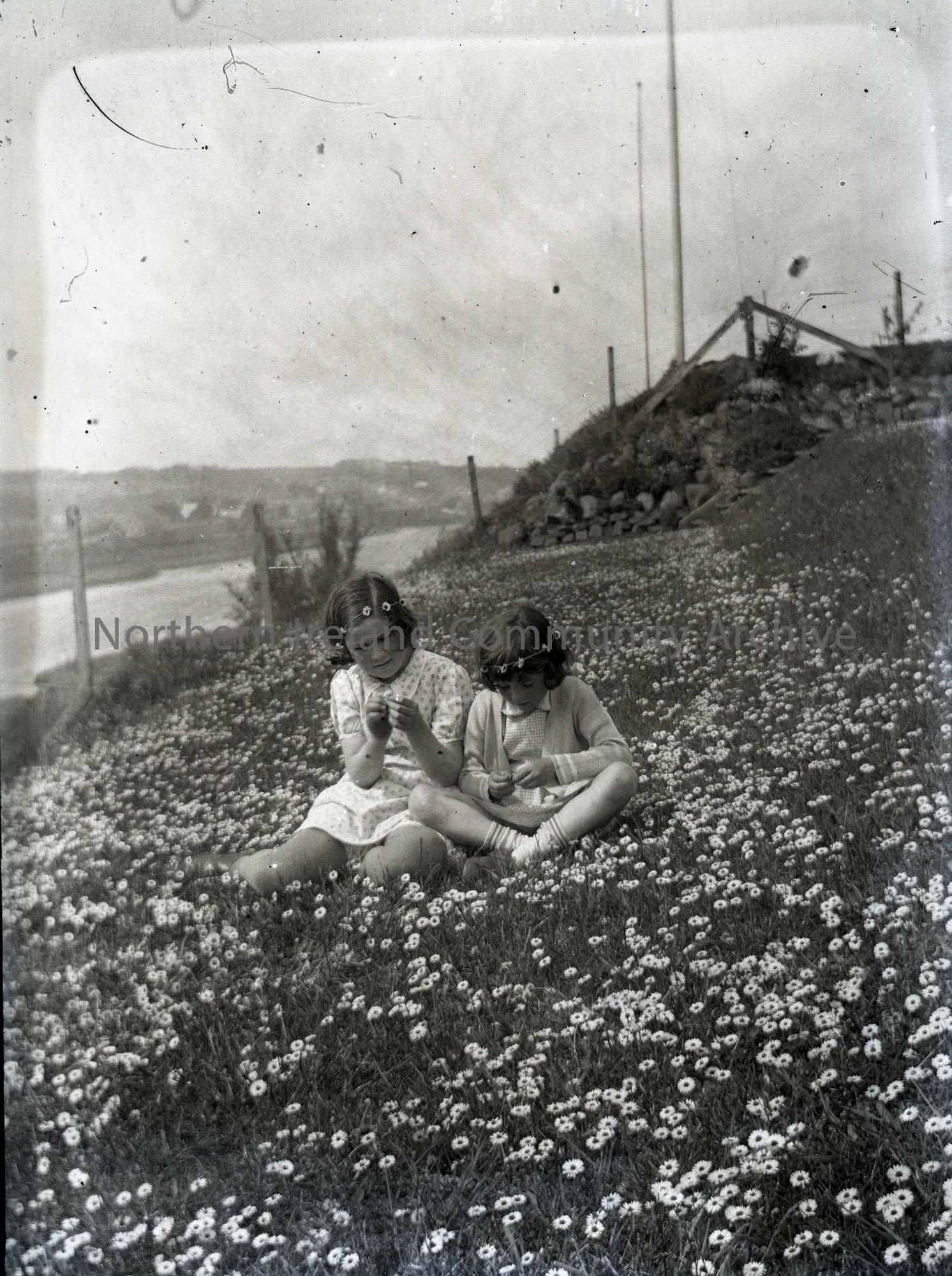 Glass slide negative of a black and white photographic image. Features two young girls sitting in a garden of daisies with daisy chain garlands on their heads. Sam's daughter, Olive, on left side?