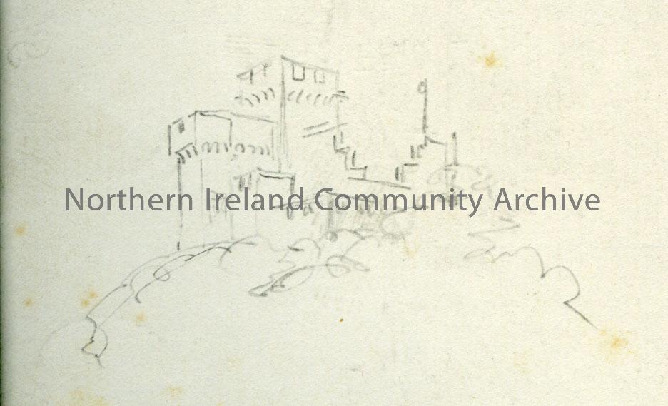 drawing titled, 'Glenarm' by Hugh Thomson for 'Highways and Byways in Donegal and Antrim' by Stephen Gwynn. Depicts church spire, trees, mountains and sea front. Could possibly be for page 298 in book. Signed by Hugh Thomson and dated 98. with preliminary image of castle on reverse of original.