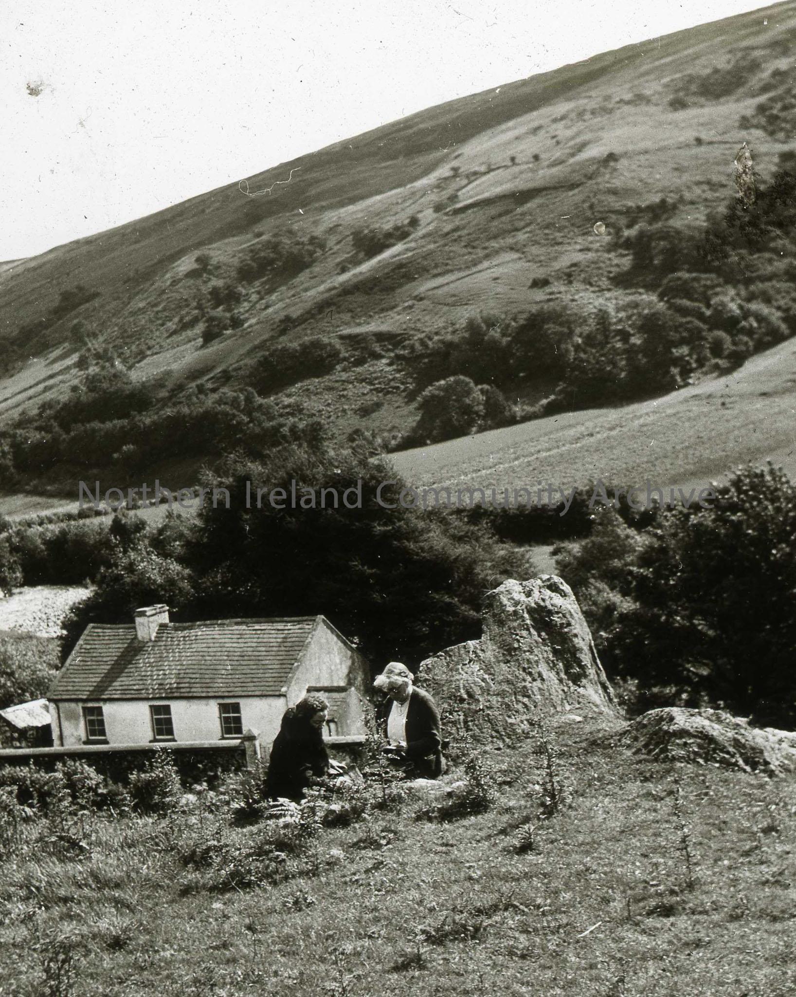 Glendun School - rural scene - upper storey of small whitewashed building and 2 women in foreground